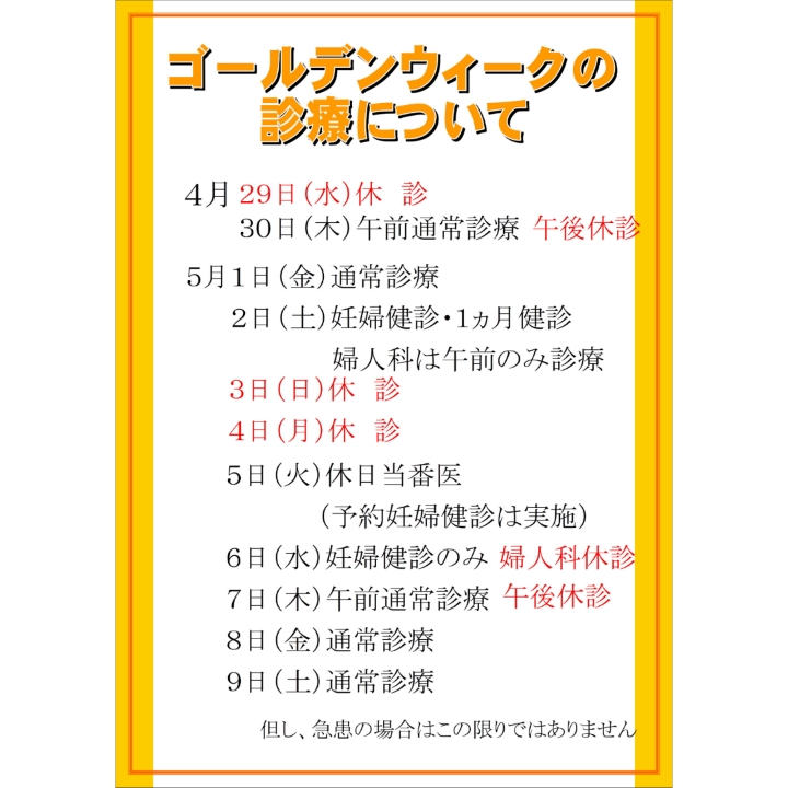 - ゴールデンウィークの診療日程をお知らせいたします。...